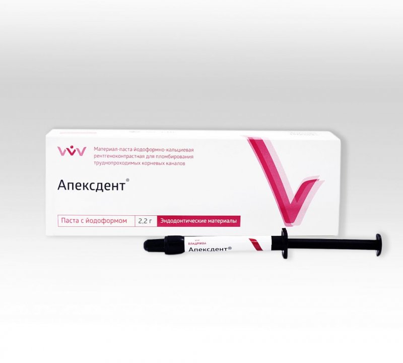 Стоматологический материал «Апексдент» с иодоформом выпус-кается в виде готовой к применению пасты, относится к типу долготвер-деющих материалов (аналогично «Vitapex») и соответствует требованиям ГОСТ Р 51059-97.